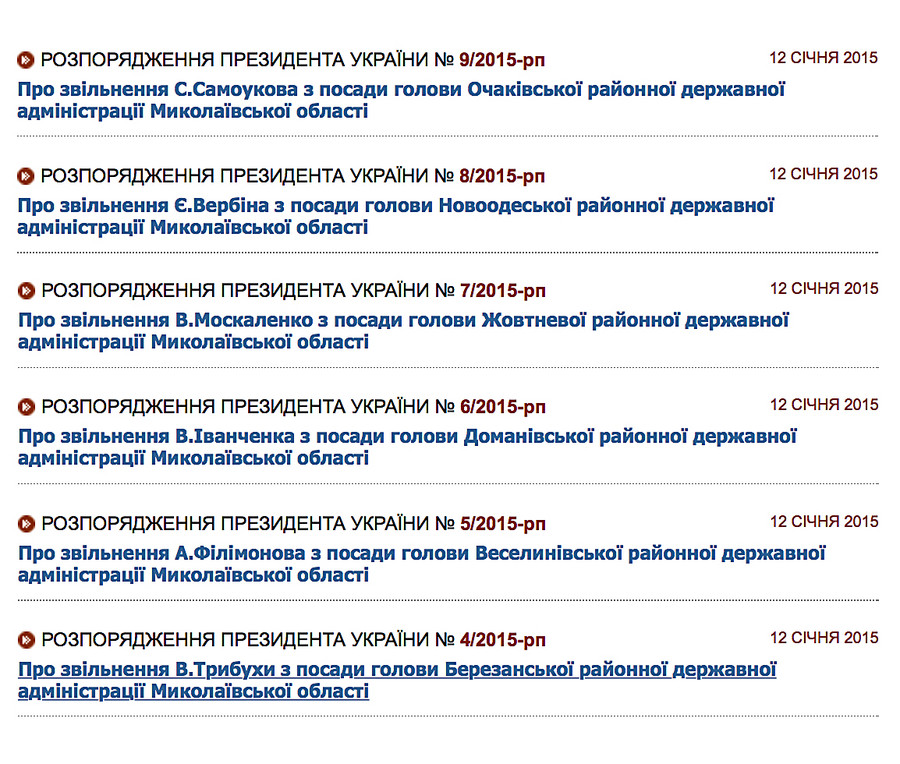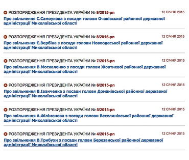 Also, gemäß den Verordnungen von Poroschenko, sind zuerst von Positionen abgewiesen worden, und werden andererseits ernannt: Kopf des Ochakovs RGA Sergey Samoukov, <9 Jahre alt>Kopf des Neuen Odessa RGA Evgeny Verbin, <10 Jahre alt>Kopf von Zhovtnevy RGA Victoria Moskalenko, <11 Jahre alt>Kopf von Domanevsky RGA Vasily Ivanchenko, <12 Jahre alt>Kopf von Veselinovsky RGA Anatoly Filimonov und Kopf von Berezansky RGA Vladimir Tribukha.