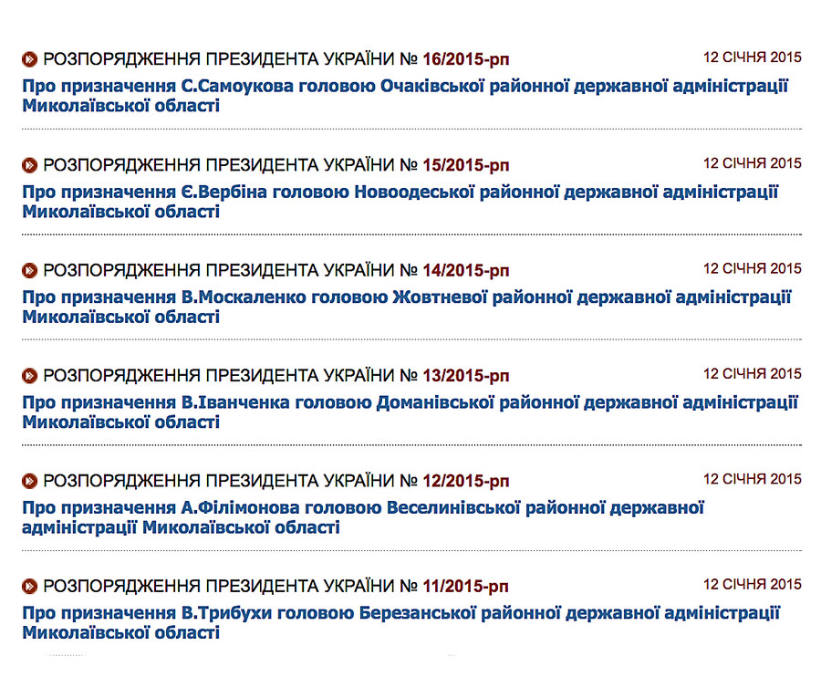 Der Präsident der Ukraine Petro Poroshenko hat mehrere Verordnungen unterzeichnet, gemäß denen er zuerst abgewiesen, und andererseits sechs Leiter von regionalen öffentlichen Verwaltungen in Nikolayevshchina ernannt hat, die zu Positionen noch vom stellvertretenden Präsidenten Oleksandr Turchynov ernannt worden sind.