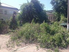 Angestellte des Unternehmens schneiden einen Baum und klären die Fahrbahn von Zweigen. Der Teil der Inzhenernaya Street von der Lenin Avenue bis die Potemkinskaya Street wird blockiert.