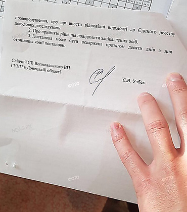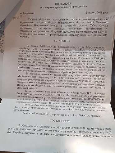 Но следователь Узбек, который закрыл в прошлый раз производство, закрыл его и в этот раз. При этом в постановлении говорится о том, что материалы уголовного производства по этому факту, но с другой квалификацией – часть 1 статьи 146 Уголовного Кодекса Украины («Незаконное лишение свободы»), по подследственности из следственного подразделения Главного управления Нацполиции в Николаевской области направлены в Волновахский отдел полиции, в связи с чем было принято решение о закрытии производства по части 4 статьи 407 УКУ («Самовольное оставление воинской части или места службы»), тем самым оставив производство только по «похищению».