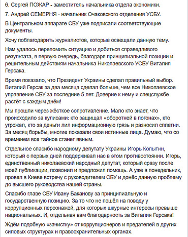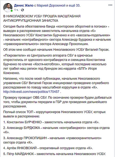 Приказом главы СБУ выведены в распоряжение семь сотрудников УСБУ Украины в Николаевской области, среди которых заместитель руководителя ведомства Петр Майданюк и и.о. начальника спецподразделения по борьбе с коррупцией и организованной преступностью (отдел «К») Константин Бурченко.