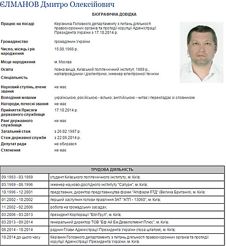 Кроме того, руководителем Главного департамента по противодействию коррупции назначили человека, который не имеет никакого отношения к антикоррупционной деятельности. Руководителем департамента стал Дмитрий Елманов – бывший муж коммунистки Оксаны Калетник. Елманова считают человеком руководителя администрации президента Бориса Ложкина. До назначению, Елманов был его советником вне штата.