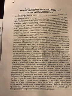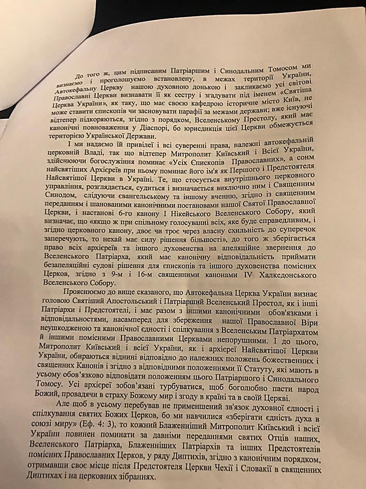 «...Таким образом такое решенное и рассужденное и в радости оповещенное вам от уважаемого Центра Православия было соборно утверждено, для постоянного хранения выдается этот Патриарший и Синодальный Томос,.. врученный в точной и идентичной копии Блаженнейшему предстоятелю Святейшей Церкви Украины, кир Епифанию и Его Превосходительству Президенту страны господину Петру Порошенко, для вечного доказательства и постоянного представления. Года две тысячи девятнадцатого, месяца января, 6 числа, индиктиона 12», - говорится в документе.