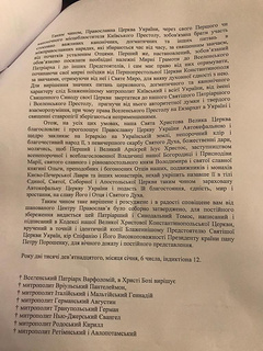 В документе, в частности указано: «... Наша Святая Христова Большая Церковь благословляет и провозглашает Православную Церковь Украины Автокефальной».