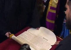 Затем развернули свиток с томосом, выполненным на пергаменте, и Варфоломей подписал его.