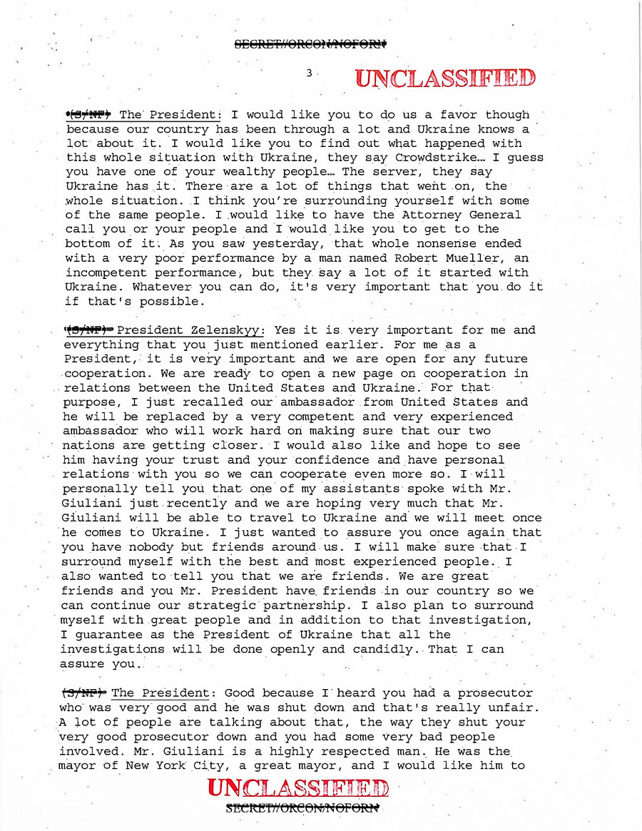 Трамп: Я бы хотел, чтоб вы оказали нам услугу, потому что ваша страна через это прошла, вся Украина знает об этом. Я бы хотел, чтобы вы узнали о ситуации с Украиной, с компанией «Crowdstrike». Я думаю, у вас есть один из ваших обеспеченных людей... Много вещей происходят с этой ситуацией. Я думаю, вы окружаете себя похожими людьми. Я бы хотел, чтобы вы или ваши люди созвонились с Генеральным прокурором, потому что я бы хотел разобраться в этой ситуации. Как вы видели вчера, весь этот абсурд закончился очень скудным спектаклем человека по имени Роберт Мюллер, некомпетентным спектаклем, но говорилось о том, что все началось с Украины. Что бы вы сделали, это будет очень важно, если вы сделаете все возможное.