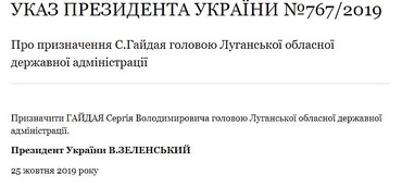 И следующим приказом назначил на должность главы Луганской ОГА Сергея Гайдая.