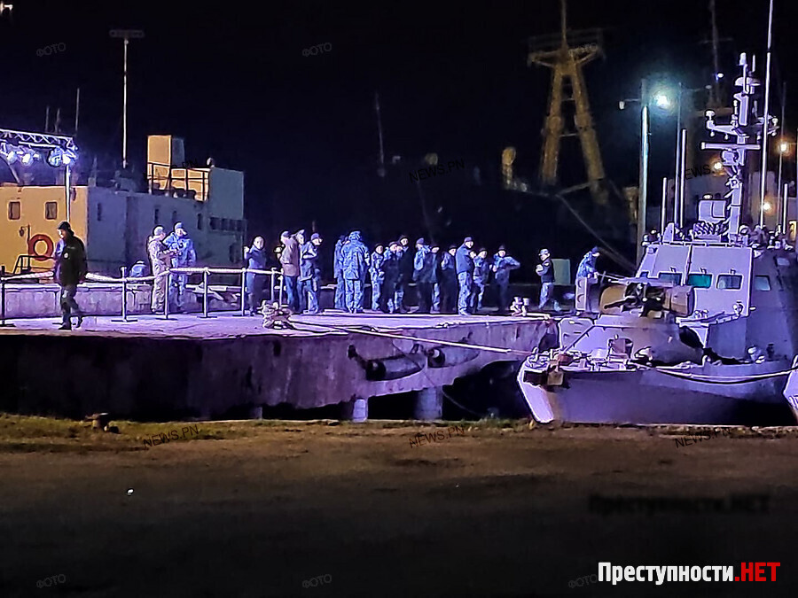 22:36 Вернувшиеся в Украину военные корабли находятся возле причала в порту Очакова, к ним вышли члены экипажей - моряки, которых вернули из российского плена.
