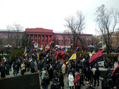 12:11 На марше преимущественно люди с националистическими красно-черными флагами. Ведущий инструктирует людей, пришедших на марш, чтоб они встали по колонам, согласно областям. Сообщается, что присутствуют люди из Харьковской, Ивано-Франковской, Винницкой областей.