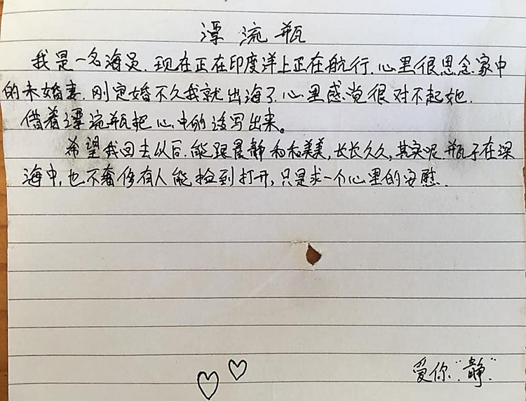 «До глубины сердца я скучаю по своей невесте. Я пошел в море сразу после помолвки. Я очень сожалею об этом. Эта бутылка является способом выразить мою любовь от всего сердца. Надеюсь, что когда вернусь домой, то уже буду с Джин навсегда. Эта бутылка будет глубоко в океане, и я не ожидаю, что кто-то ее найдет или даже откроет. Я просто ищу, как помочь душевной боли».