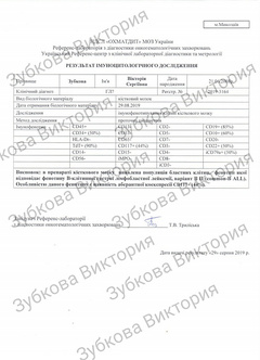«В конце августа все изменилось...Началось все с повышения температуры и слабости в организме. Температуру сбили, но она через сутки вернулась. После проведения общего анализа крови, доченьку госпитализировали в Николаевскую областную больницу в отделение гематологии. Вскоре поставили точный диагноз: острый B-клеточный лимфобластный лейкоз. Провели несколько блоков химиотерапии и костномозговых пункций. Образцы костного мозга отправили в Киевский Охматдет»