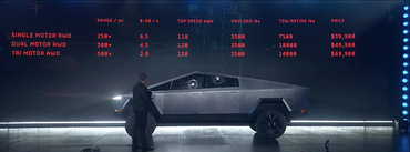 Cybertruck будет выпускаться в трех вариантах с дальностью хода на одной зарядке в 250 миль (400 километров), 300 миль (480 километров) и 500 миль (800 километров). Разные версии также отличаются количеством двигателей – от одного до трех. Футуристический дизайн автомобиля частично создан под влиянием фильма о Джеймсе Бонде «Шпион, который меня любил». Ранее глава Tesla также говорил о влиянии фильма «Бегущий по лезвию» на облик пикапа.
