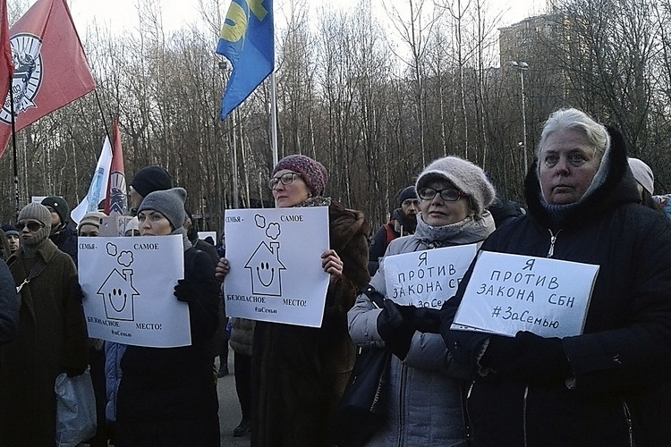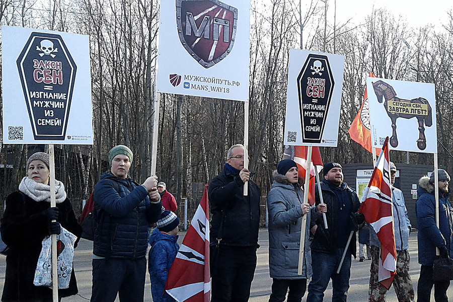 Митингующие пришли с плакатами «Не трогай семьи, госпожа Пушкина!», «Закон СБН (семейно-бытовое насилие) – изгнание мужчин из семьи», «Сегодня СБН, завтра ЛГБТ?».