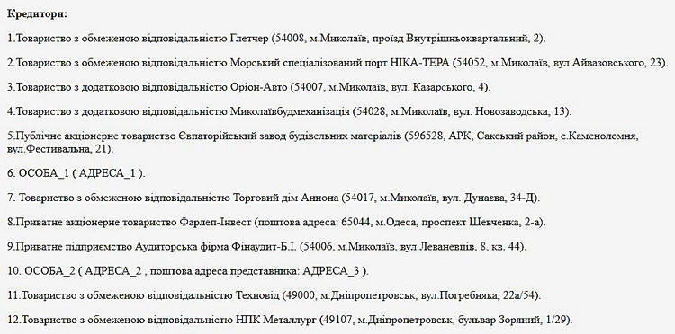 На заседании присутствовали прокурор Людмила Жмура, арбитражный управляющий Ирина Сербин, представитель компании «Пойзантер Холдингз ЛТД». Большая часть кредиторов в лице государственных учреждений, коммунальных предприятий и фирм, и представитель николаевского управления юстиции отсутствовали.