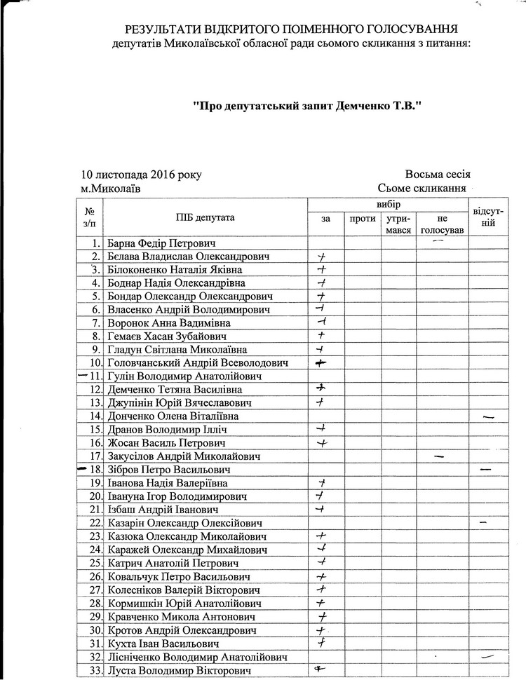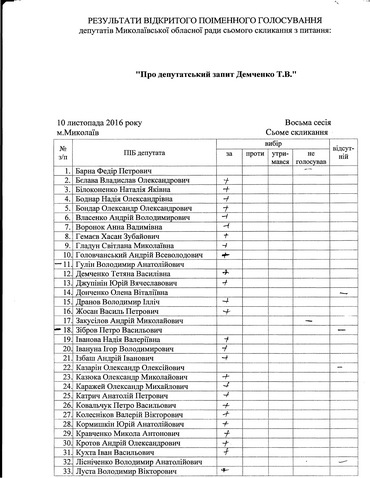 Як повідомлялося раніше цей запит депутати розглянули першим, відразу після емоційного виступу губернатора Миколаївській області Олексія Савченко. «За» проголосували 46 депутатів, при цьому двоє–не голосували (Андрій Закусилов з фракції «Наш Край» і Федір Барна - позафракційний).